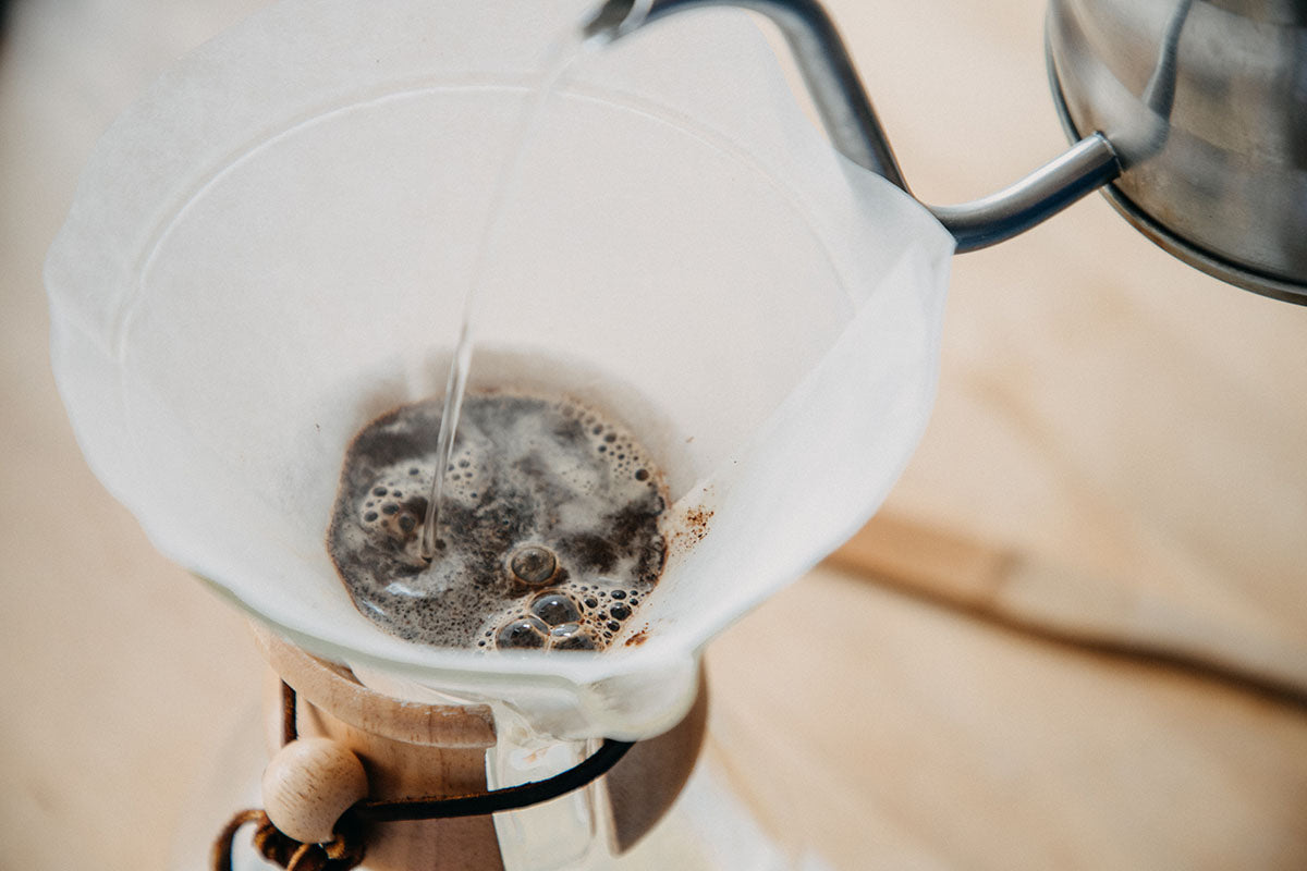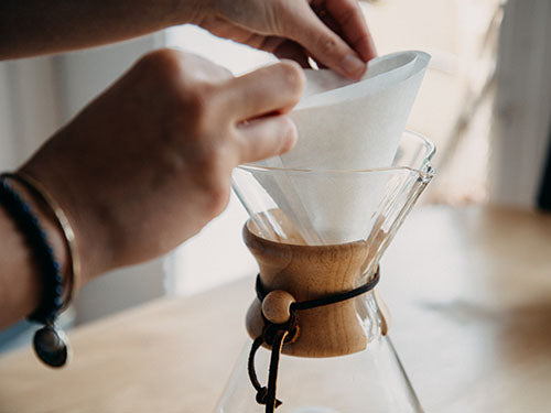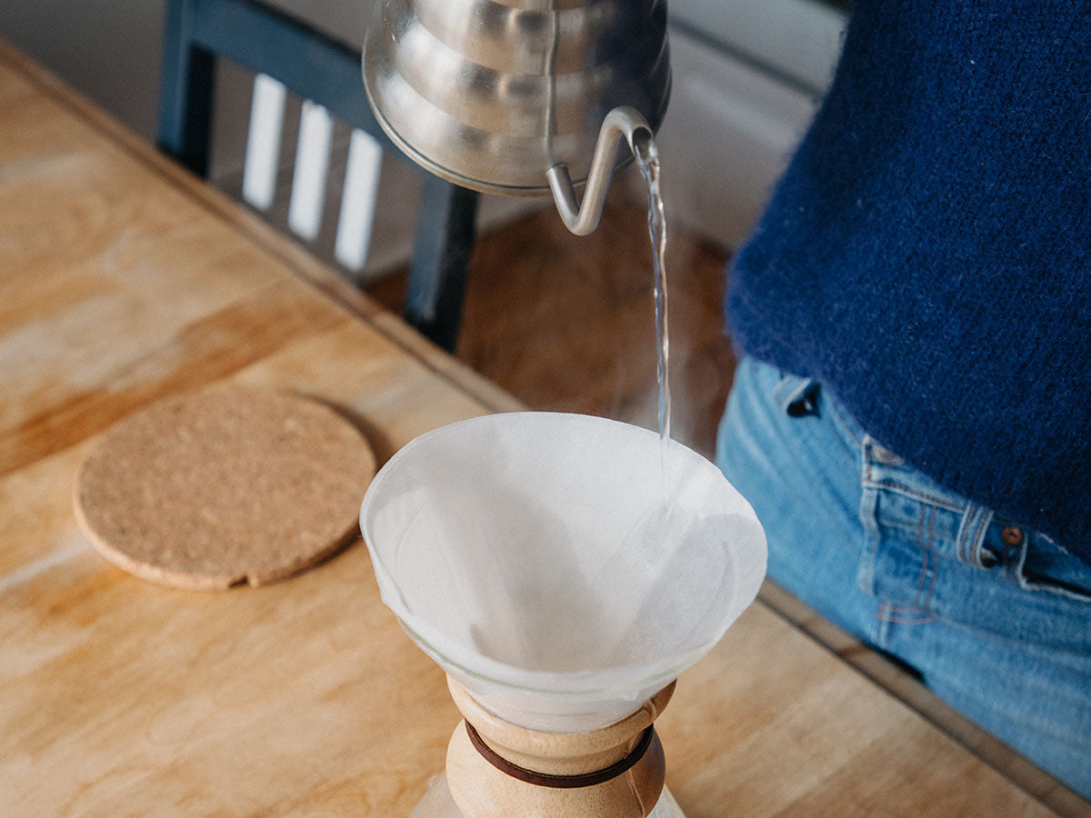 Remplir la bouilloire d’eau fraîche filtrée et porter à ébullition. Déplier le filtre et le placer dans le Chemex, de manière à ce que la partie à trois plis soit du côté du bec verseur sans l’obstruer