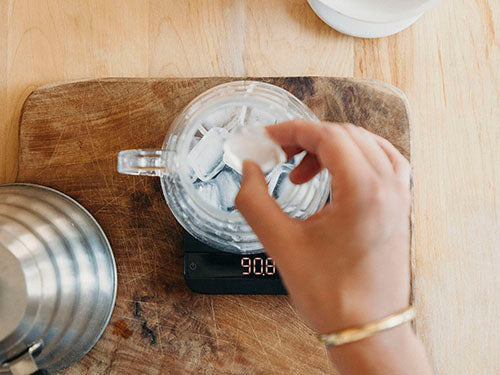 Placer la carafe sur la balance et doser 100g de glaçons. Placer l’infuseur sur la carafe et y déposer le café moulu.