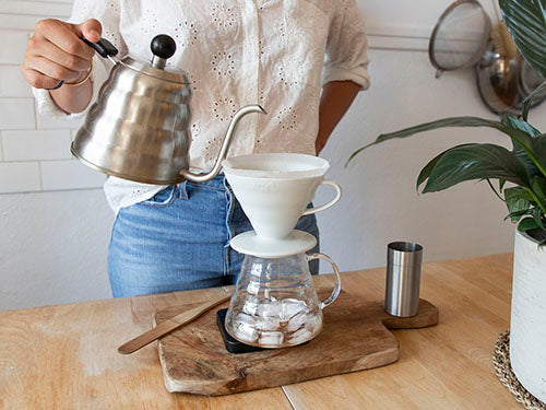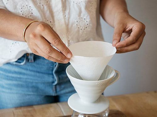 Placer un filtre en papier dans l'infuseur, mettre celui-ci sur une carafe ou une tasse. Bien rincer le filtre afin d’atténuer le goût de papier et vider ensuite l’eau de la carafe. Remettre l’eau à bouillir.